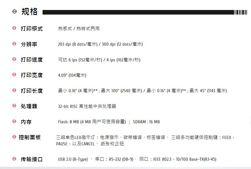 超值的工業(yè)型條碼打印機(jī),全金屬結(jié)構(gòu)打造堅(jiān)固、耐用、高印量的品質(zhì)讓您以最低的負(fù)擔(dān)擁有最堅(jiān)實(shí)的效能表現(xiàn) 內(nèi)建紙張自動(dòng)偵測(cè)定位鍵及網(wǎng)絡(luò)端口 打印模式可支援熱感/熱轉(zhuǎn)兩用 打印頭更換簡(jiǎn)易無需使用工具 碳帶內(nèi)外卷自動(dòng)切換設(shè)計(jì),安裝方便、使用簡(jiǎn)單 模組化的設(shè)計(jì),維護(hù)更容易
