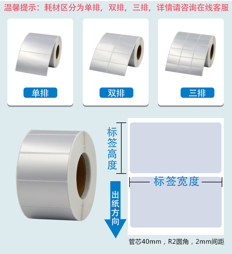 材質(zhì):啞銀標簽紙 膠水:水膠 規(guī)格:單排 雙排 三排 四排 打印方式:熱轉(zhuǎn)印打印 搭配碳帶:需要碳帶 實用機型:有熱轉(zhuǎn)印打印機功能的打印機 應用范圍:廣泛應用于超市,餐飲,酒店,銀行,電信,醫(yī)療等各個行業(yè)